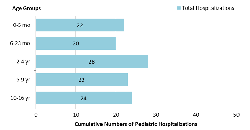 | Age-group (years) | Hospitalizations (n= >206) | ICU admissions (n= <9) | Deaths (n= <5) |