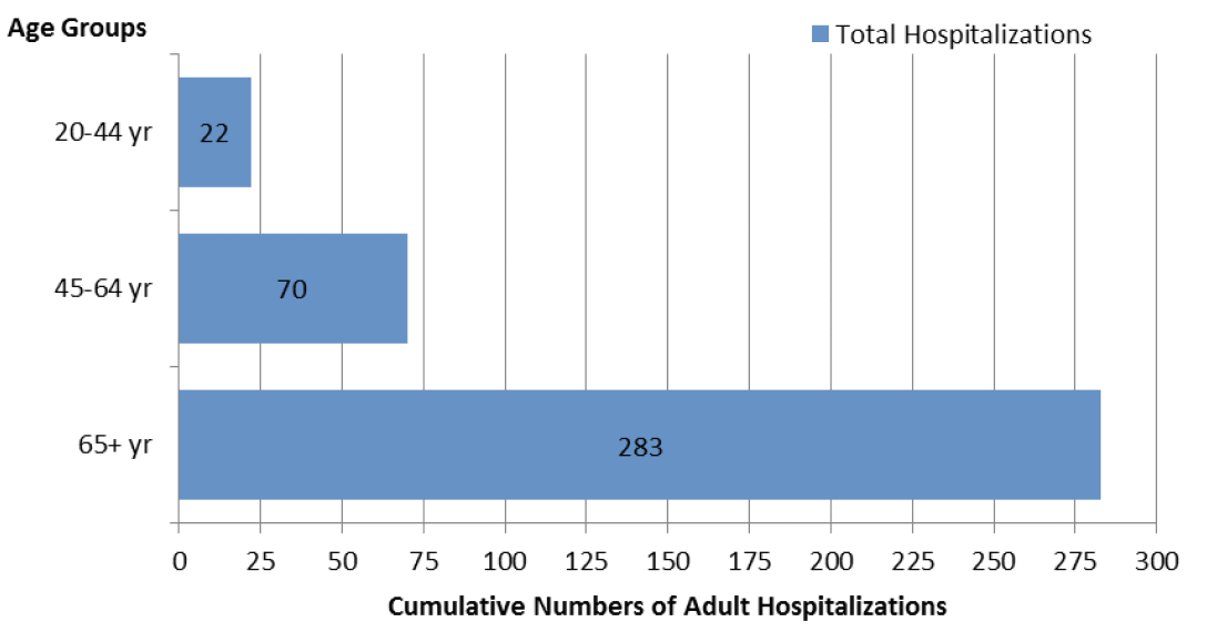 To date this season, 375 laboratory-confirmed influenza-associated adult (≥20 years of age) hospitalizations have been reported by CIRN. All but three hospitalized cases were due to influenza A. Adults aged 65+ accounted for 75% of hospitalizations. To date, greater than eighteen ICU admissions and seven deaths have been reported.