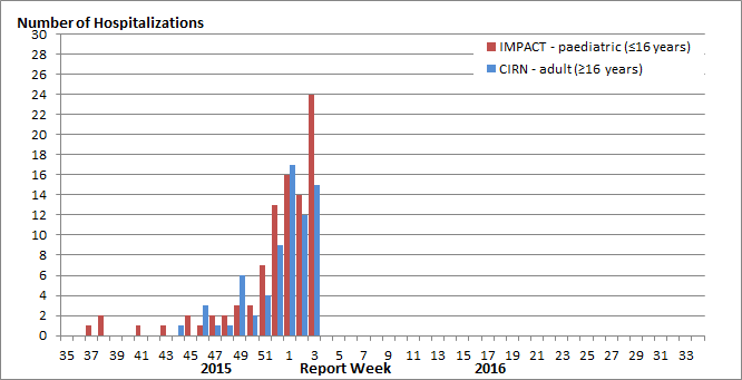 Note: The number of hospitalizations reported through CIRN-SOS and IMPACT represents a subset of all influenza-associated adult and paediatric hospitalizations in Canada. Delays in the reporting of data may cause data to change retrospectively.