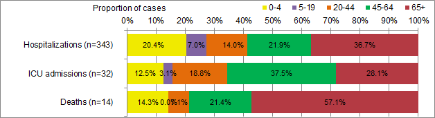 | Age-group (years) | Hospitalizations (n=343) | ICU admissions (n=32) | Deaths (n=14) |