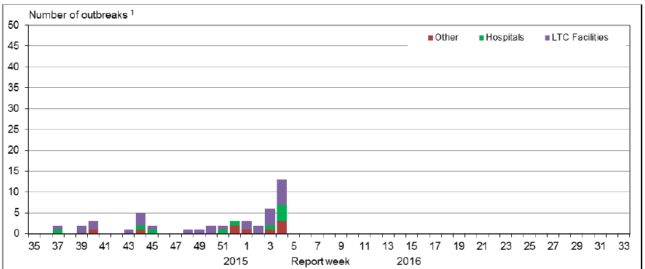 To date this season, 63 outbreaks have been reported (29 of which occurred in LTCFs). In comparison, at week 04 in the 2014-15 season, 1,146 outbreaks were reported (589 of which occurred in LTCFs) and in the 2013-14 season, 67 outbreaks were reported (37 of which occurred in LTCFs).