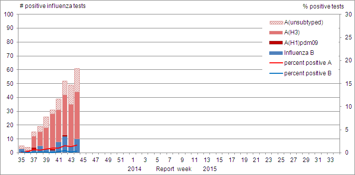 The number of positive influenza tests increased to 61 influenza detections (2.0% of tests) in week 44).