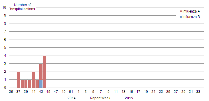 Since the start of the 2014-15 season, 59 laboratory-confirmed influenza-associated hospitalizations have been reported from participating provinces and territoriesFootnote *; 55 were cases of influenza A, of which the majority were A(H3N2); 49% were patients ≥65 years of age (Table 6). No ICU admissions were reported. Six deaths with influenza A have been reported in adults ≥45 years of age.