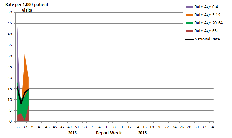 Influenza-like illness consultation rate by age-group in week 38 for the 2015-16 season: Age 0-4: 10.1; Age 5-19: 20.2; Age 20-64: 14.9; Age 65+: 7.4