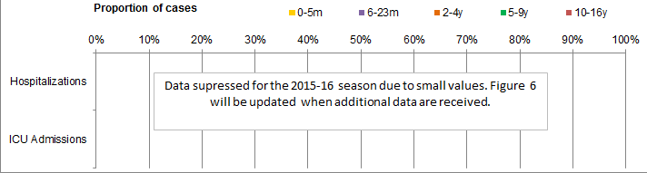 Figure 6. Percentage of hospitalizations, ICU admissions and deaths with influenza reported by age-group, Canada, 2015-16, Paediatric hospitalizations (≤16 years of age, IMPACT)