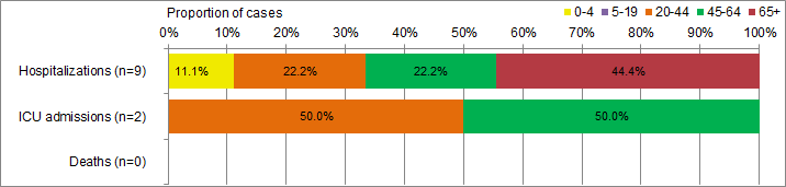| Age-group (years) | Hospitalizations (n=9) | ICU admissions (n=2) | Deaths (n=0) |