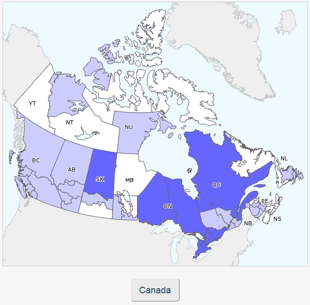 Abbreviations: Newfoundland/Labrador (NL), Prince Edward Island (PE), New Brunswick (NB), Nova Scotia (NS), Quebec (QC), Ontario (ON), Manitoba (MB), Saskatchewan (SK), Alberta (AB), British Columbia (BC), Yukon (YT), Northwest Territories (NT), Nunavut (NU).