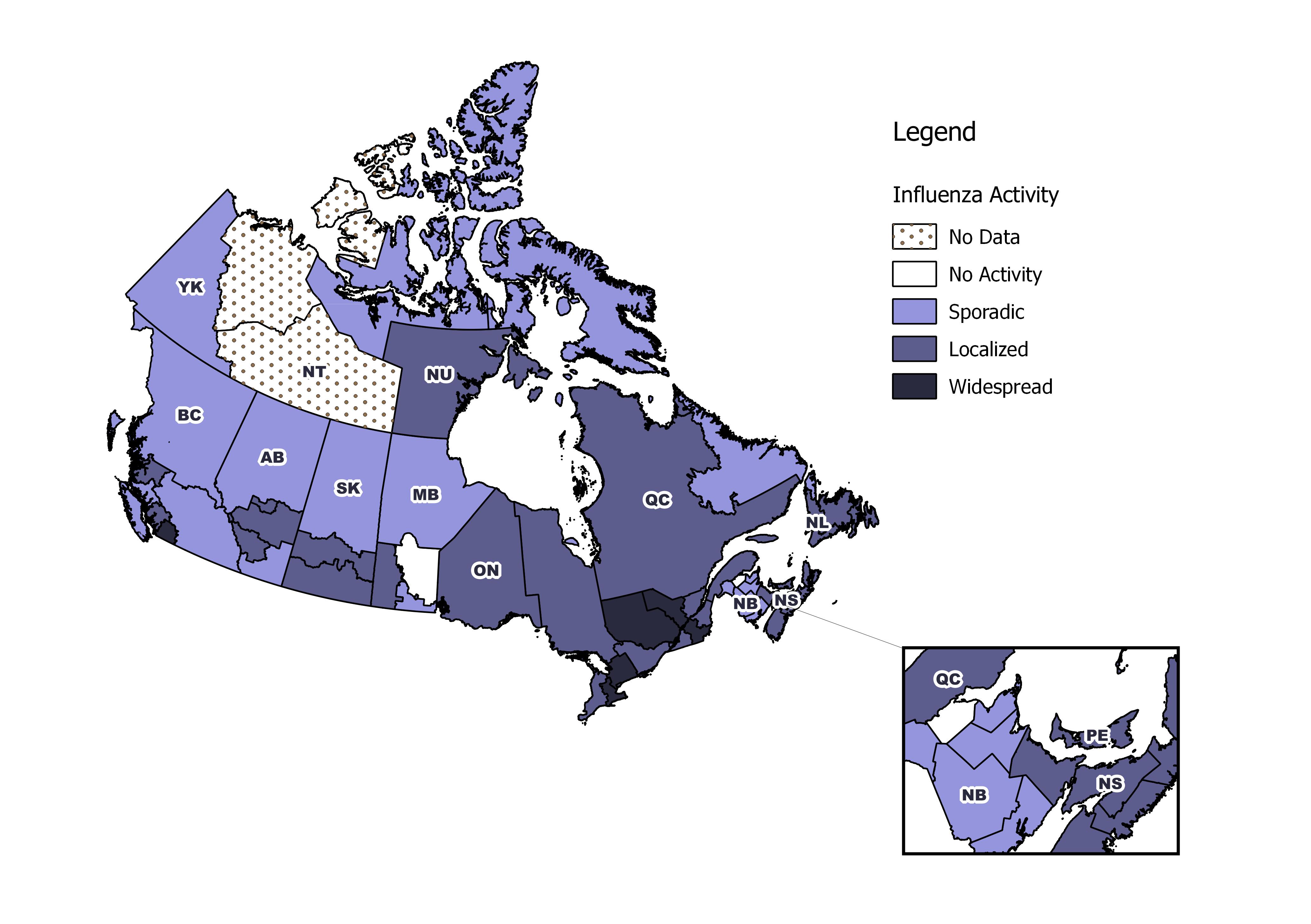 Note: Influenza/ILI activity levels, as represented on this map, are assigned and reported by Provincial and Territorial Ministries of Health, based on laboratory confirmations, sentinel ILI rates and reported outbreaks. Please refer to detailed definitions at the end of the report. Maps from previous weeks, including any retrospective updates, are available in the mapping feature found in the Weekly Influenza Reports.