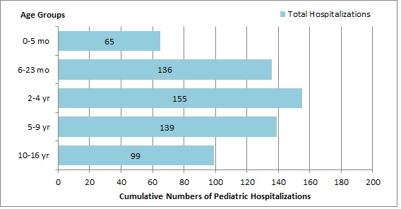 To date this season, 594 pediatric hospitalizations have been reported by the IMPACT network, 378 (64%) of which were associated with influenza A. Children 0-23 months accounted for the largest proportion of influenza A hospitalizations (39%). Among the 216 hospitalizations due to influenza B, children 5-9 years accounted for the largest proportion of cases (31%).