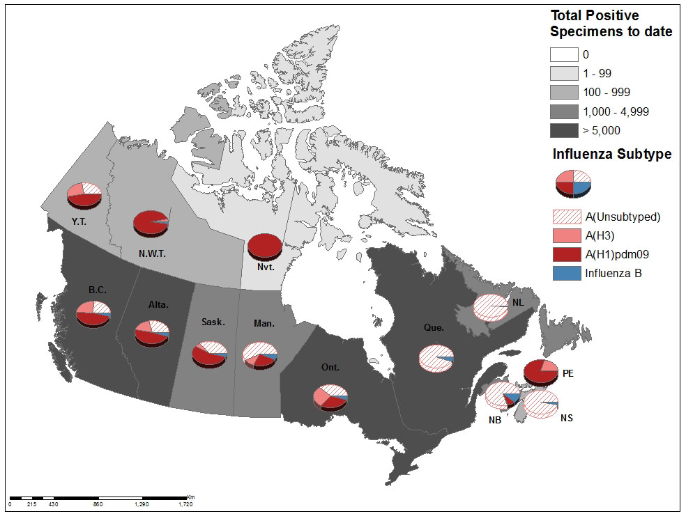 - The distribution of influenza detections by type and subtype in provinces and territories was similar to the national distribution. The proportion of detections of influenza B was between zero and 5%. Among jurisdictions from which influenza A subtype information was provided, the proportion of A(H1N1) ranged from 62 to 100% of subtyped influenza A detections (Figure 3).