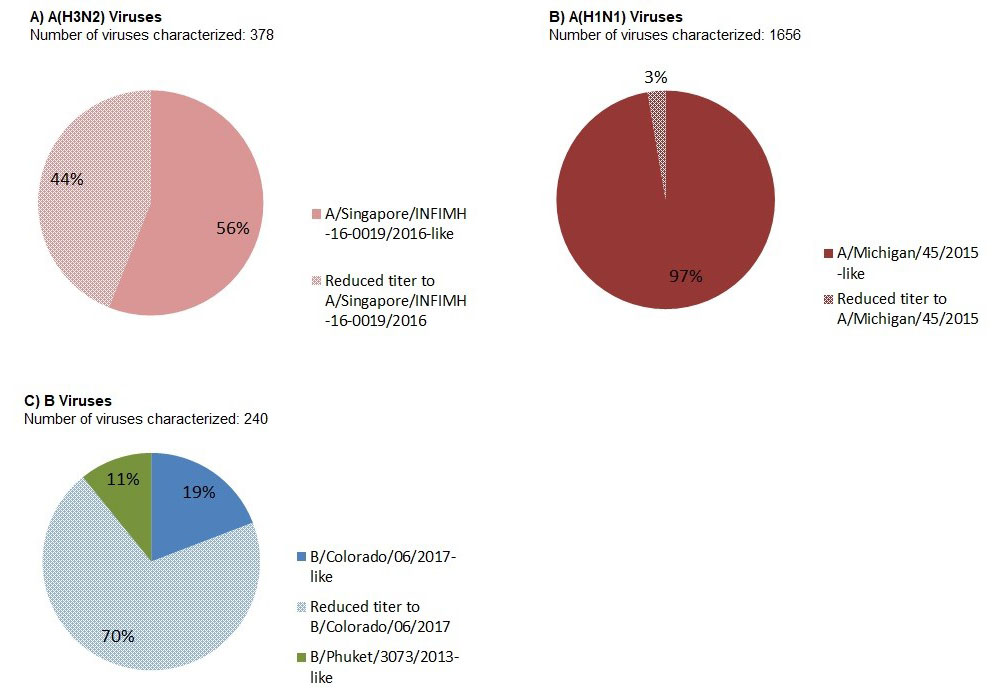 Approximately 97% (1612) of the A(H1N1) viruses characterized were antigenically similar to A/Michigan/45/2015, while only 3% (44) of viruses showed reduced titer with ferret antisera raised against cell culture-propagated A/Michigan/45/2015 (Figure 13-B).