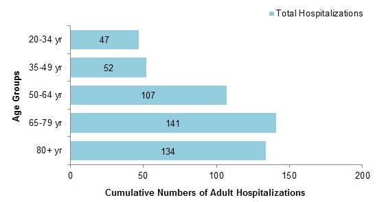 - A greater proportion of hospitalizations have been reported among adults ≥65 years of age (57.2%) compared to adults <65 years of age (42.8%).