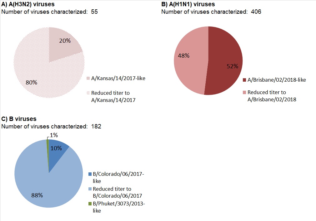Genetic characterization was also performed on 251 B/Victoria lineage viruses. All of these viruses had a three amino acid deletion (162-164) in the HA gene and belong to the genetic subclade V1A-3Del. Viruses belonging to genetic subclade V1A-3Del are antigenically distinct from the vaccine strain B/Colorado/06/2017, which belongs to genetic subclade V1A.1.