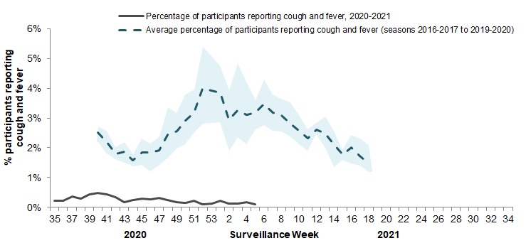 - 12,356 participants reported to FluWatchers and 13 (0.11%) participants reported cough and fever, which remains low compared to previous seasons. Provide valuable information to track flu and COVID-19 across Canada: Sign up to become a FluWatcher!