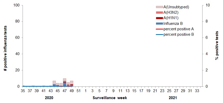 - To date, there is no evidence of community circulation of influenza; however, influenza testing continues at elevated levels. Seven laboratory detections of influenza were reported in week 49.