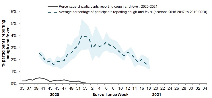 In week 53, 12,502 participants reported to FluWatchers and 15 participants (0.14%) reported symptoms of cough and fever (Figure 5). The percentage of participants reporting cough and fever remains at very low levels and may be a direct effect of individual and public health measures enacted to reduce the spread of COVID-19. FluWatchers reporting is not impacted by changes in health services or health seeking behaviours.