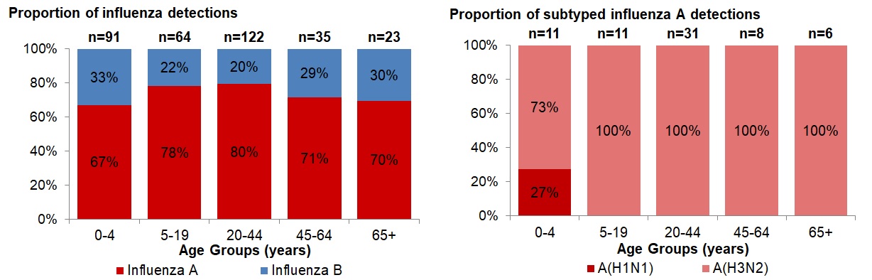 Detailed information on age and type/subtype has been received for 335 laboratory-confirmed influenza detections (Figure 4). Among the 335 detections, 277 (83%) were in individuals under the age of 45. Included in the cumulative detections this season are 11 co-infections of influenza A and B (total of 22 detections) that are suspected to be associated with recent live attenuated influenza vaccine (LAIV) receipt. Co-infections known or reported to be associated with recent LAIV have been removed by the submitting laboratory or by the Public Health Agency of Canada beginning in week 44 as they do not represent community transmission of seasonal influenza viruses.