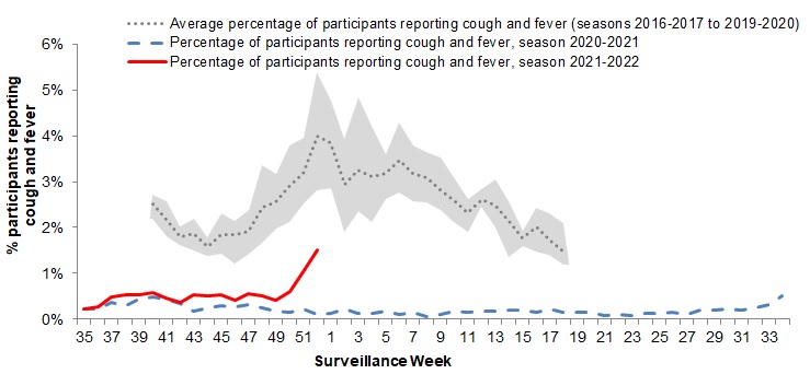 - The percentage of FluWatchers reporting fever and cough was 1.5% in week 52. The percentage of FluWatchers reporting fever and cough has been on an upward trend for the past few weeks.