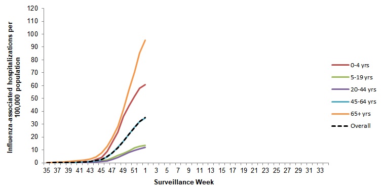 - Adults aged 65 years of age and older accounted for 47% of reported hospitalizations. The highest cumulative hospitalization rates were among adults 65 years of age and older 95/100,000) and children under 5 years of age (61/100,000).