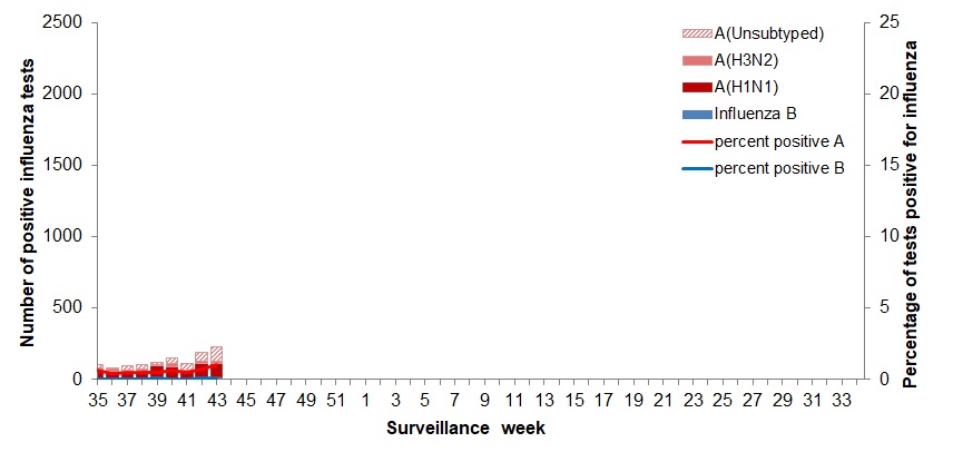 - In week 43, the percentage of tests positive for influenza was 1.2% and a total of 254 laboratory detections (233 influenza A and 21 influenza B) were reported.