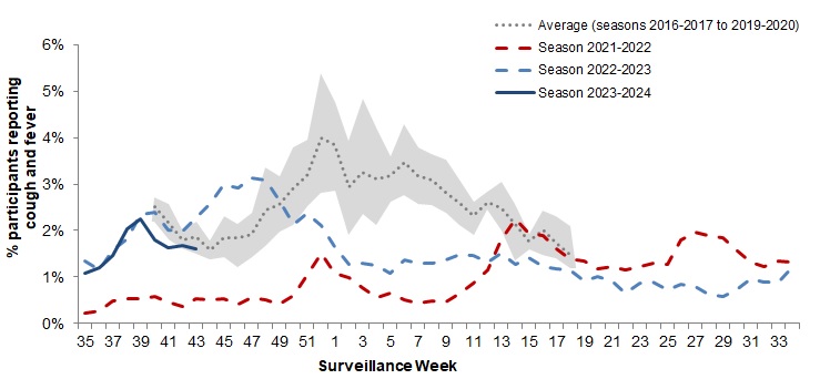 - The percentage of FluWatchers reporting cough and fever was 1.6% in week 43. The percentage of FluWatchers reporting cough and fever is within levels typical of this time of year.