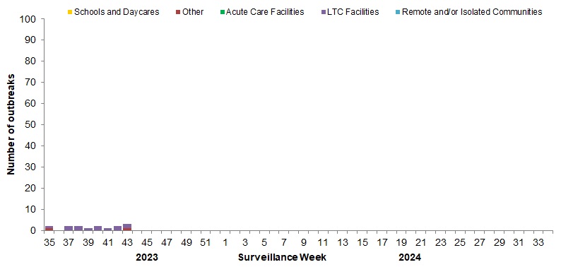 - From August 27, 2023 to October 28, 2023 (weeks 35 to 43), 15 laboratory-confirmed influenza outbreaks have been reported (3 laboratory-confirmed influenza outbreaks were reported in week 43).