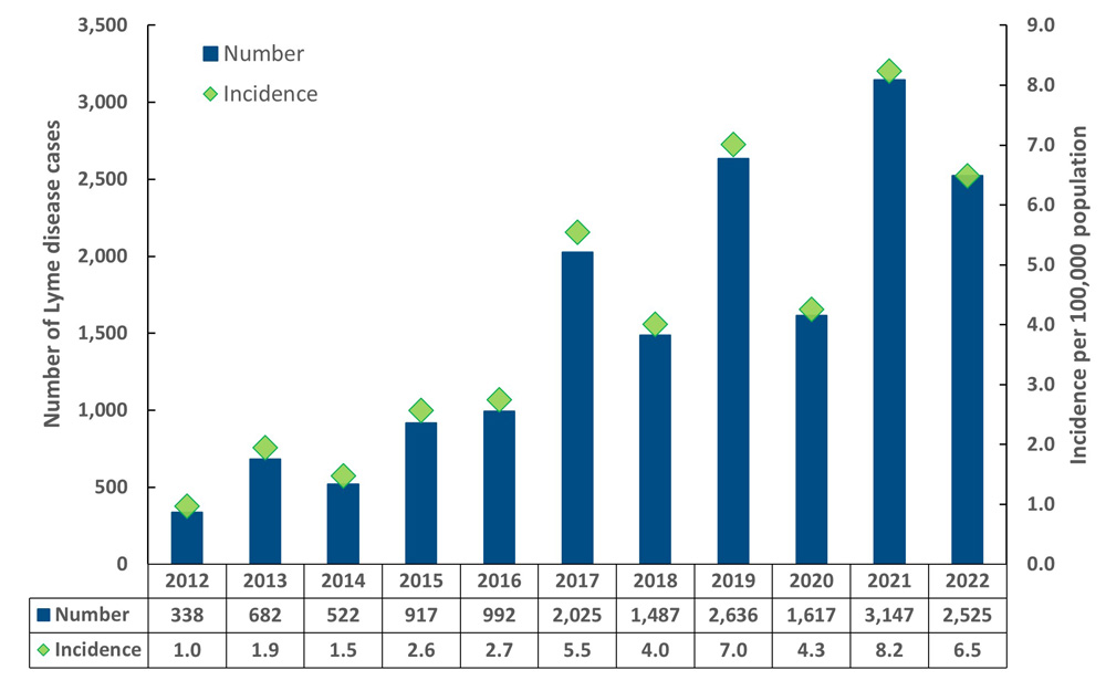 In 2022, 2,525 cases of Lyme disease including locally acquired and travel-related cases were reported in Canada. Of these, 2,093 (82.9%) were confirmed and 432 (17.1%) were probable cases.
