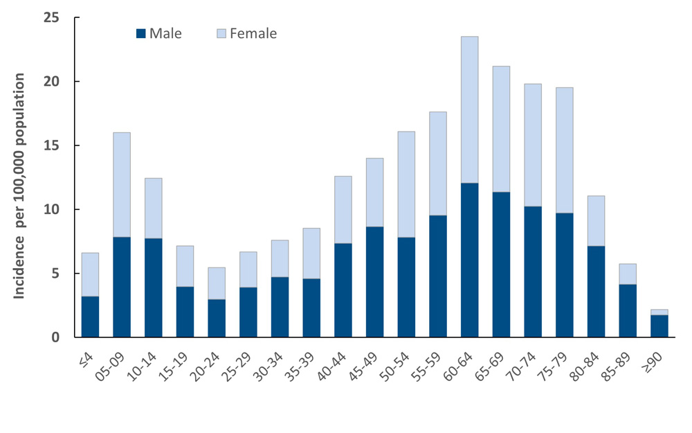 Age | Incidence per 100 000 – Male | Incidence per 100 000 – Female |