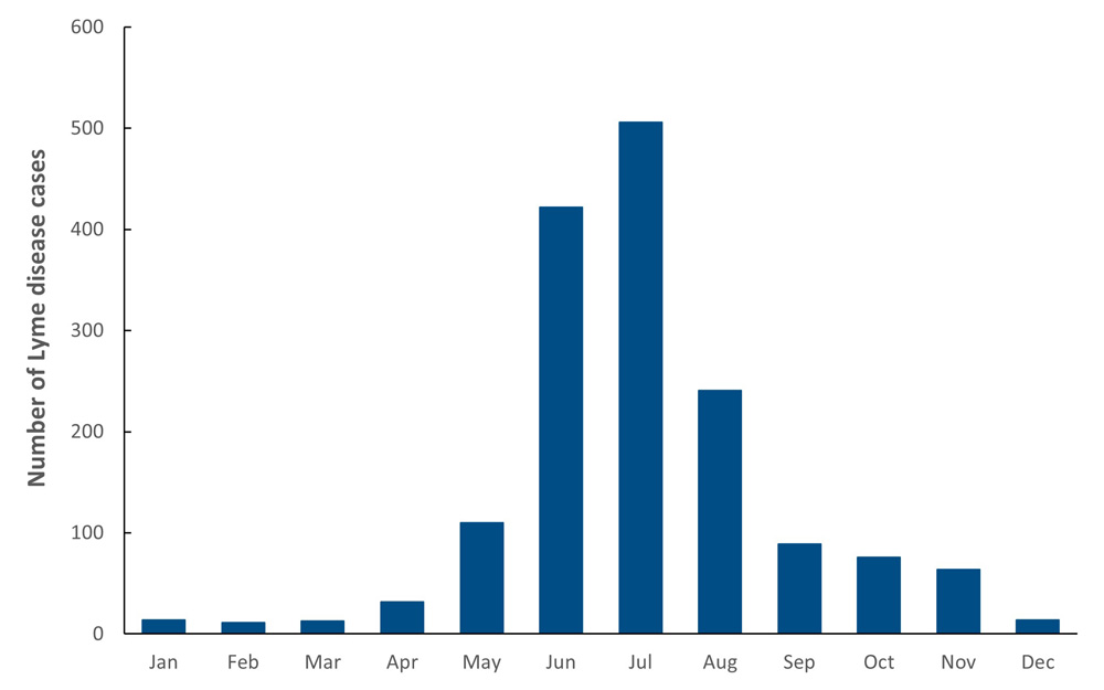 In 2022, 1,592 locally acquired cases included a date of illness onset. Lyme disease cases occurred in every month of the year; however, 94.7% occurred between May and November. More than 73.4% of the cases had a reported illness onset during the months of June (26.5%), July (31.8%), and August (15.1%) (Figure 5).