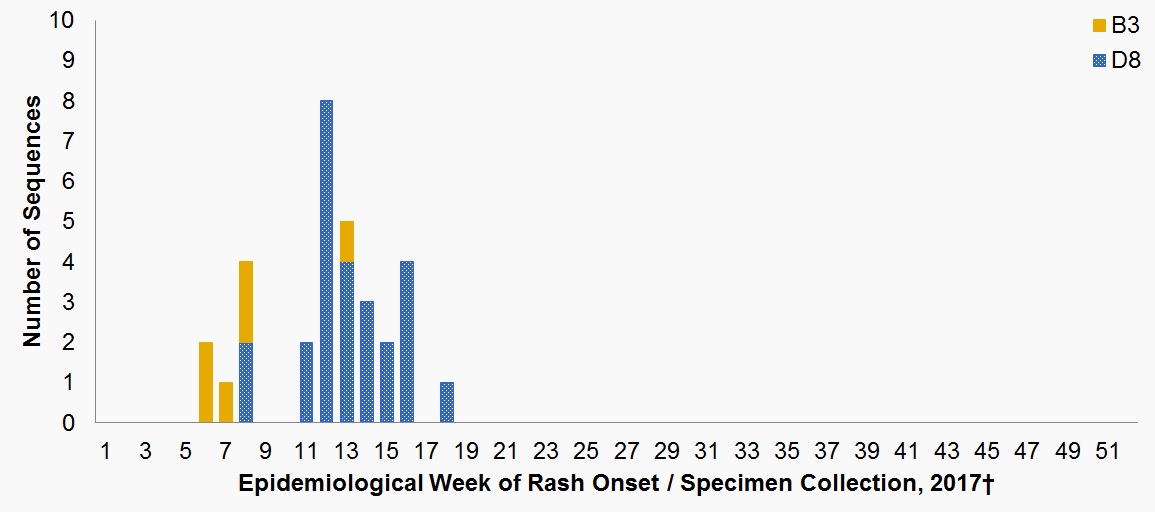 To date in 2017, 32 measles cases have been genotyped and the genotypes are B3 (n=6) and D8 (n=26) (Figure 3). Genotype information is pending for 1 additional case.