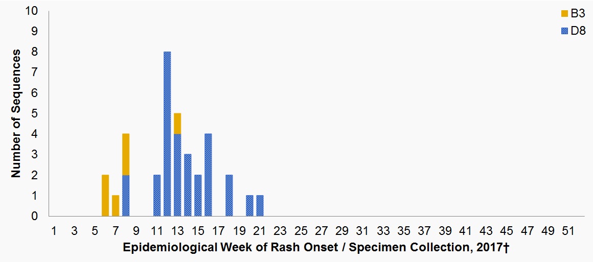 To date in 2017, 35 measles cases have been genotyped and the genotypes are B3 (n=6) and D8 (n=29) (Figure 3).
