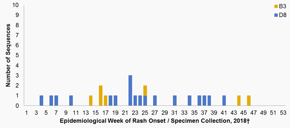 In 2018, 26 cases of measles have been genotyped and the genotypes were B3 (n=7) and D8 (n=19) (Figure 3).