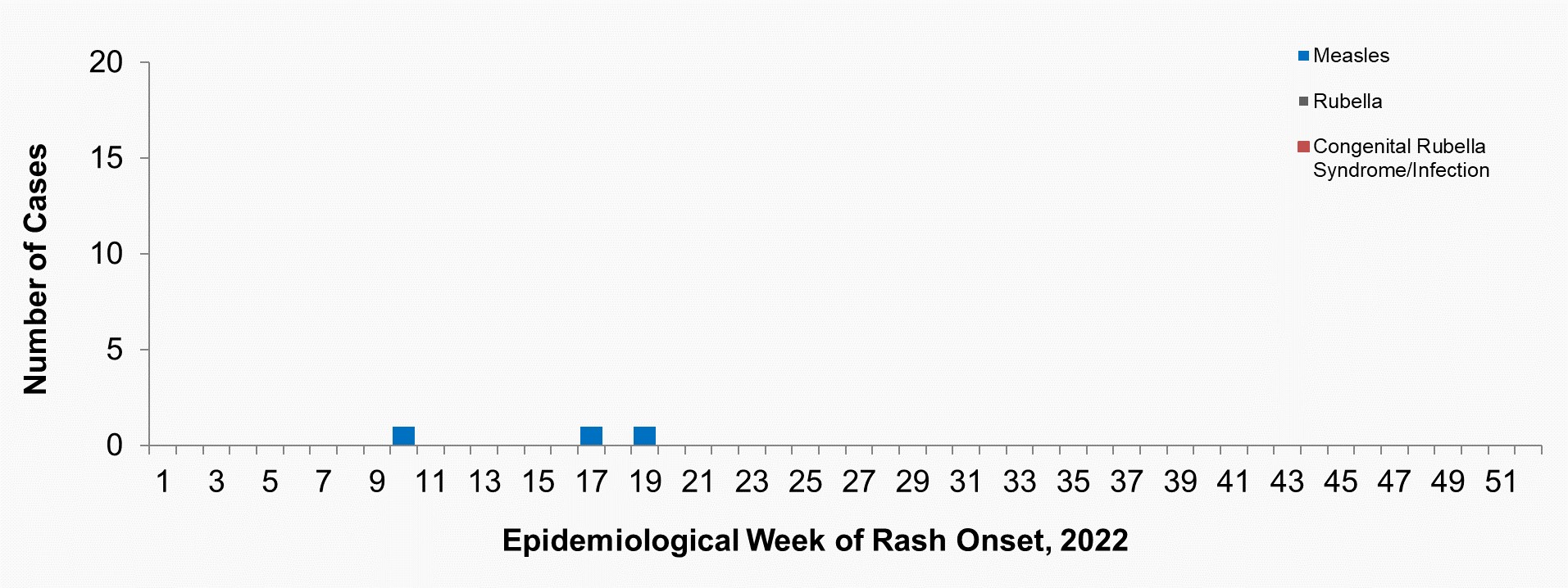 | Epidemiological Week of Rash Onset, 2022 | Number of confirmed measles cases reported | Number of confirmed rubella cases reported | Number of confirmed congenital rubella syndrome/infection cases reported |