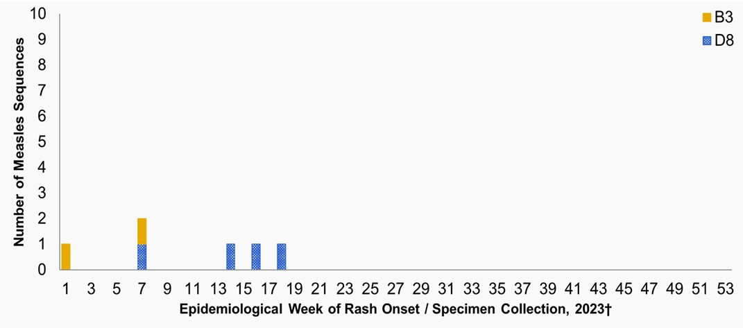 To date in 2023, six (6) cases of measles have been genotyped and the genotypes were B3 (n=2) and D8 (n=4).