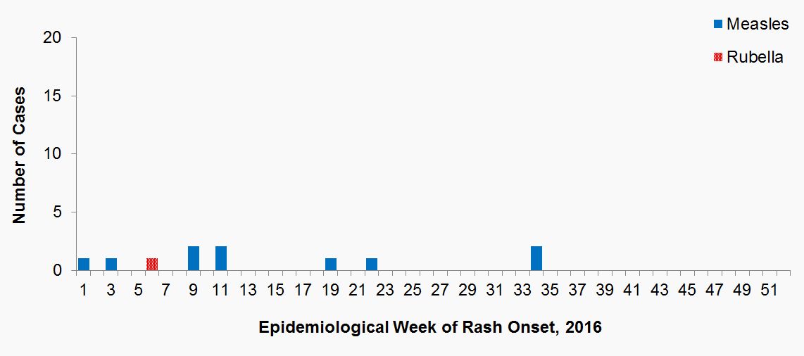 | Epidemiological Week of Rash Onset, 2016 | Number of confirmed measles cases reported | Number of confirmed rubella cases reported |