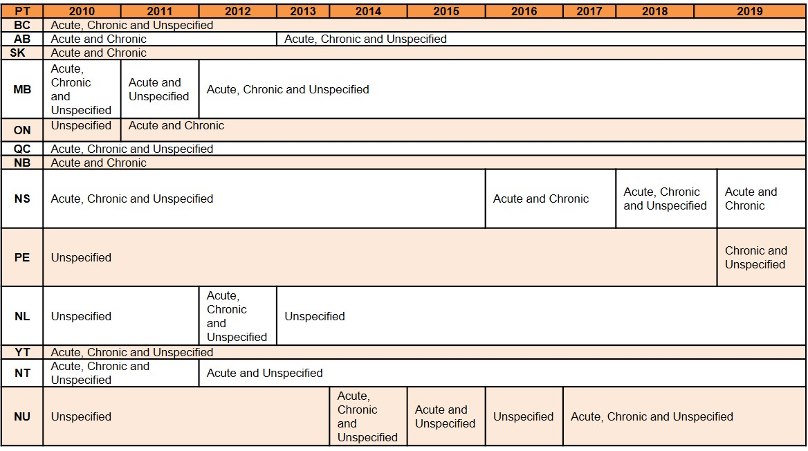 Chronic hepatitis C reporting patterns by PT: AB, BC, QC and YT reported on the chronic hepatitis C status from 2012 to 2019. NU reported on the chronic hepatitis C status from 2017 to 2019. MB reported on the chronic hepatitis C status from 2018 to 2019. All other PTs did not report by the chronic hepatitis C status from 2010 to 2019.