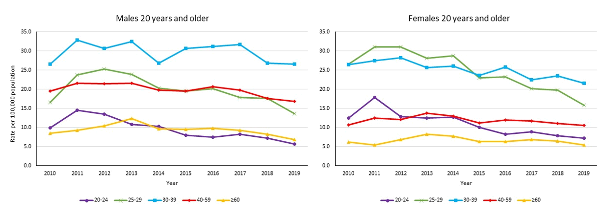 Chronic hepatitis B rates have trended downwards since 2010. Male rates have consistently been higher than female rates since 2010, but rates have lowered each year for both sexes since 2016. The 2019 national rate for males (11.4 per 100,000 population) and females (8.9 per 100,000 population) were the lowest recorded in ten years.