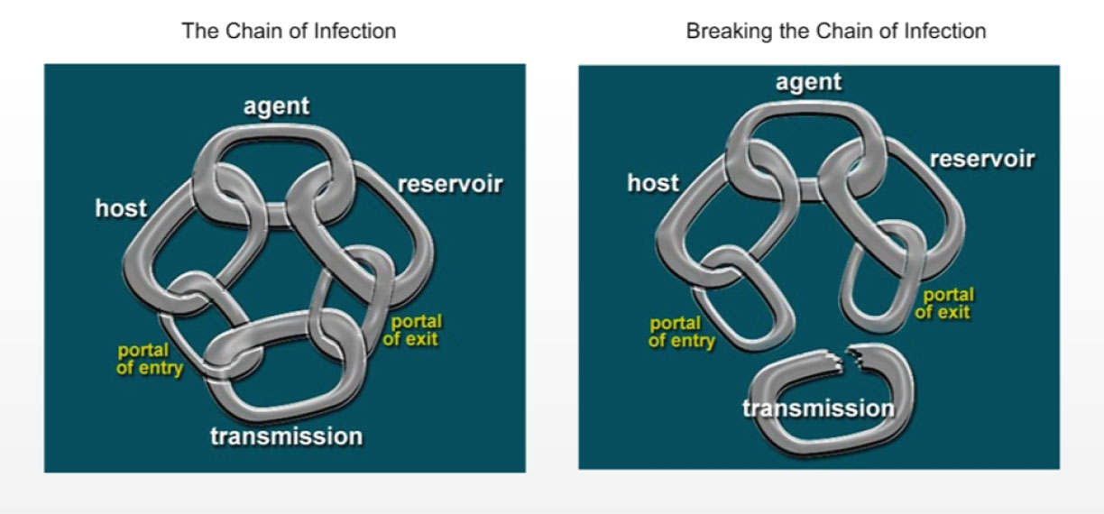 Figure 1b shows that breaking any of the links in the chain of infection as shown in Figure 1a will prevent infection from occurring.