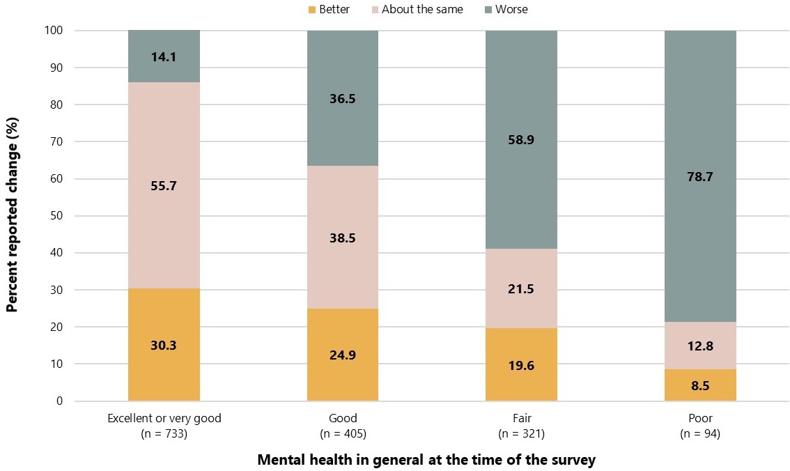 Regarding mental health during the COVID-19 pandemic, one-in-four (27%) participants reported their mental health as fair or poor. Worsening mental health since the start of the pandemic was highest among these participants compared to others who reported excellent, very good or good mental health at the time of the survey. Similar to the perception of safety at home and discrimination, this highlights how those with pre-existing conditions were disproportionately affected by the pandemic. Similar findings were observed in a Statistics Canada survey conducted in fall 2020 among people aged 18 years or older. It found among those with depression, anxiety or posttraumatic stress disorder, that the majority reported worsened mental health since the start of the pandemic Footnote 34. In this survey of ACB people, three-quarters (80%) of respondents reported being sometimes or always able to access mental health services. Reported barriers, such as difficulty getting a referral or contacting a healthcare practitioner to get information and cost of services, represent potential areas for consideration in the development of future interventions to make services more accessible.