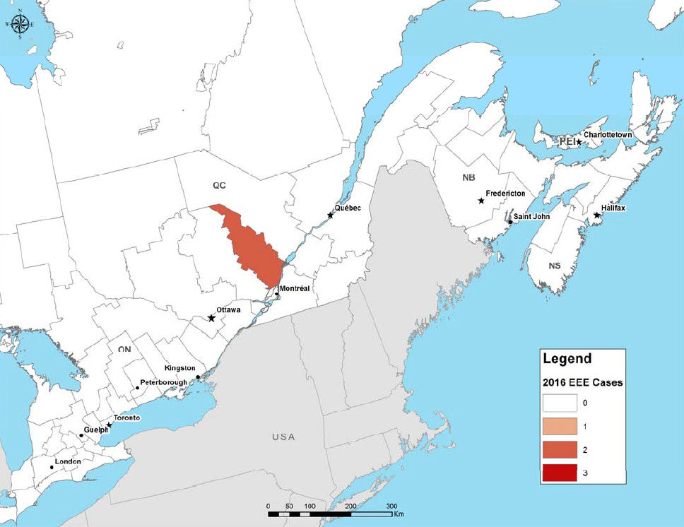 Figure 5: Geographic distribution of Eastern Equine Encephalitis in horses in Canada, 2016