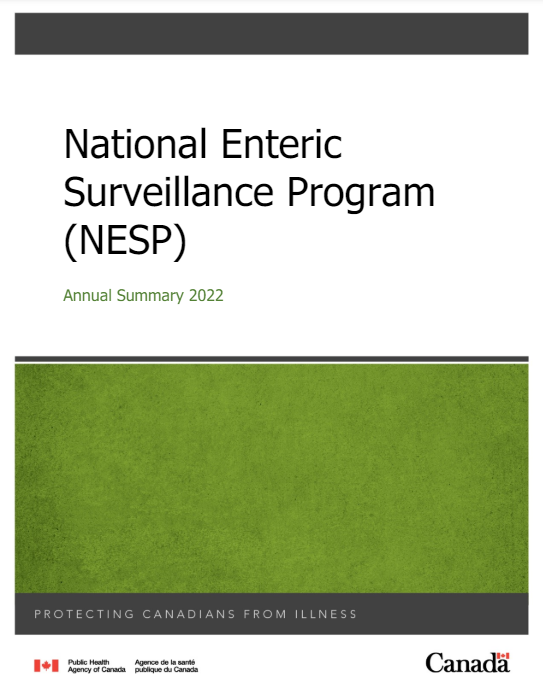 The National Enteric Surveillance Program (NESP) is a collaboration between the Public Health Agency of Canada (PHAC) and the provincial public health laboratories. Through NESP, weekly analysis and reporting is conducted for 14 different organisms causing enteric illness, including 10 organisms that are nationally notifiable. The data and information derived from this surveillance system supports detection of multi-provincial clusters and outbreaks, guides public health interventions, and are designed to integrate with national and international efforts to limit the transmission of enteric diseases.