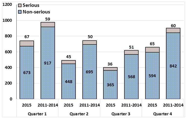 This is a stacked columns bar graph. The bars show the total number of AEFI reports received each calendar quarter(Q) with Q1 encompassing January, February and March, Q2 April, May and June, Q3 July, August and September and Q4 October, November and December. The y-axis shows the total count for each quarter, ranging from 0-1200. The x-axis is quarter and ranges from Q1 to Q4. Two time periods are depicted on the graph. The first bars show the total number of reports received in 2015 for Q1, Q2, Q3, and Q4 of 2015 only, for non-serious cases in blue and serious cases in red; non-serious: 673 during Q1, 448 in Q2, 365 in Q3, and 594 in Q4; serious: 67 in Q1, 45 in Q2, 36 in Q3, and 65 in Q4. A second set of bars shows the average number of reports of each quarter from 2011 to 2014, for non-serious cases in blue and serious cases in red: non-serious: 917 in Q1, 695 in Q2, 568 in Q3 and 842 in Q4; serious: 59 in Q1, 50 in Q2, 51 in Q3, and 60 in Q4.