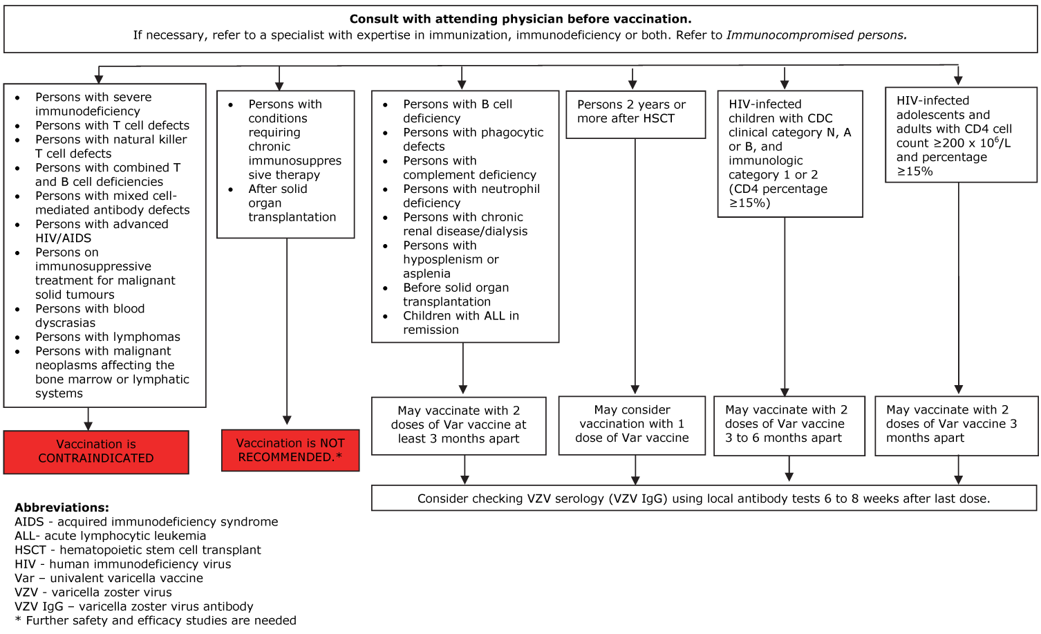 - Recipients of hematopoietic stem cell transplantation (HSCT) regardless of pre-transplant varicella immune status or post-transplant immunization history including varicella disease, vaccination or positive serologic test results