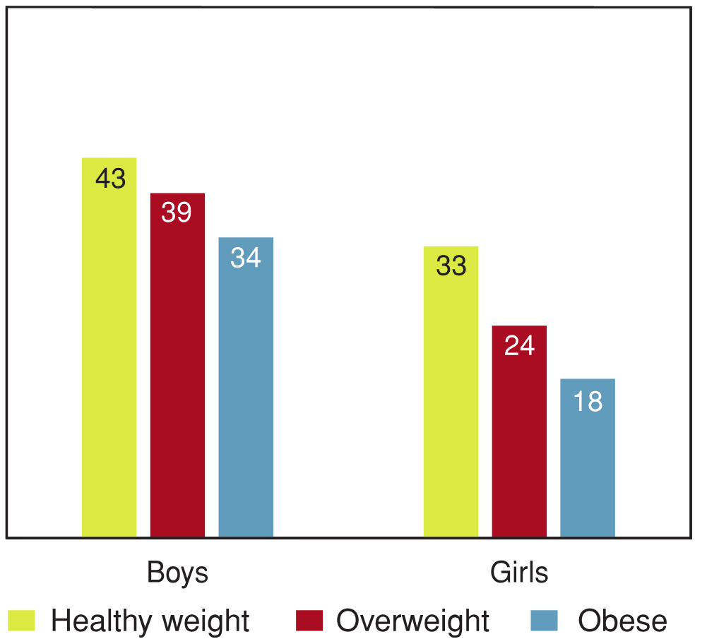 Figure 1.1 shows sample findings from a multivariable regression analysis: the relationship between emotional well‑being and body weight in boys and girls expressed as a percentage. The graph shows that 43% of boys with a healthy weight score high in emotional well‑being, compared to 39% of boys who are overweight, and 34% of boys who are obese. On the same question, 33% of girls with a healthy body weight score high in emotional well‑being, compared to 24% of girls who are overweight and 18% of girls who are obese.Organization of the report