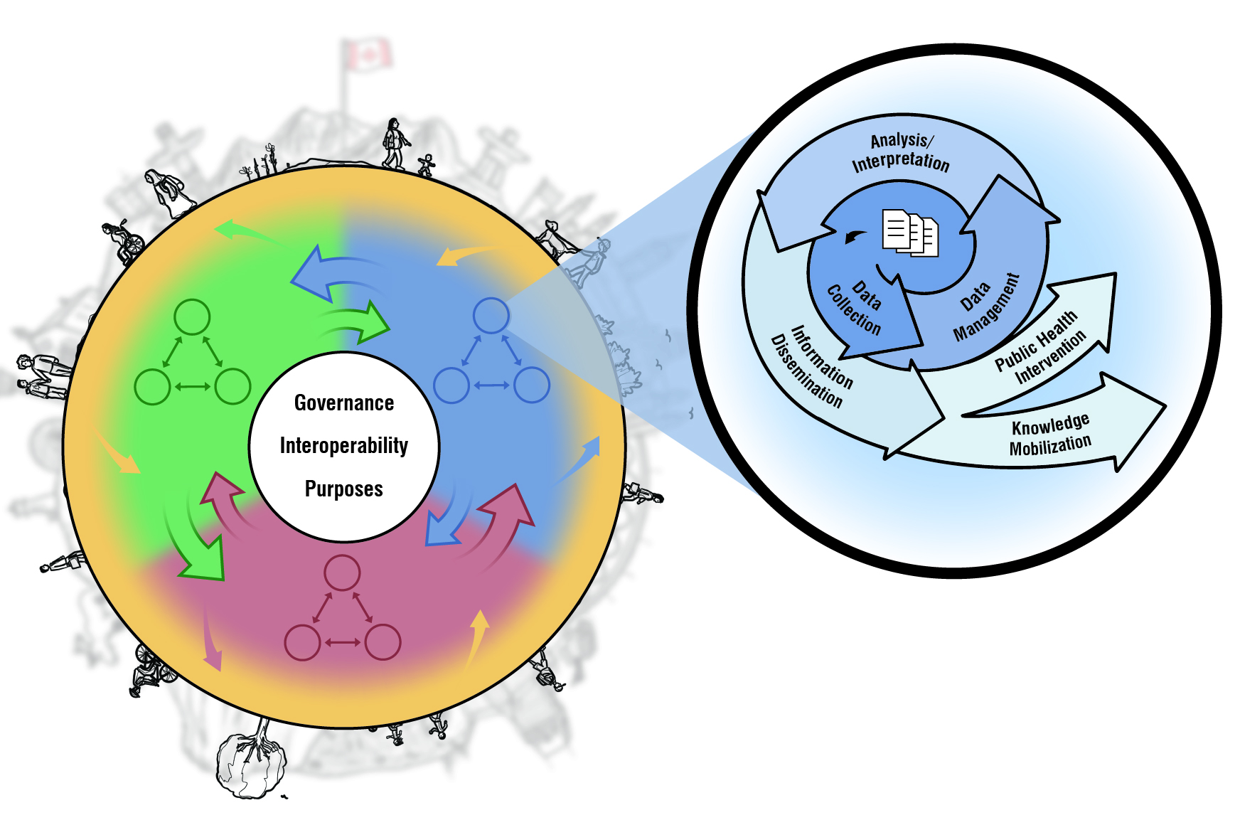 This diagram aims to demonstrate how independently operated surveillance systems and programs could exchange data and information within and between levels of government and other partners, under a unified governance, to provide timely insights for actions that improve health and reduce inequities for all people in Canada.