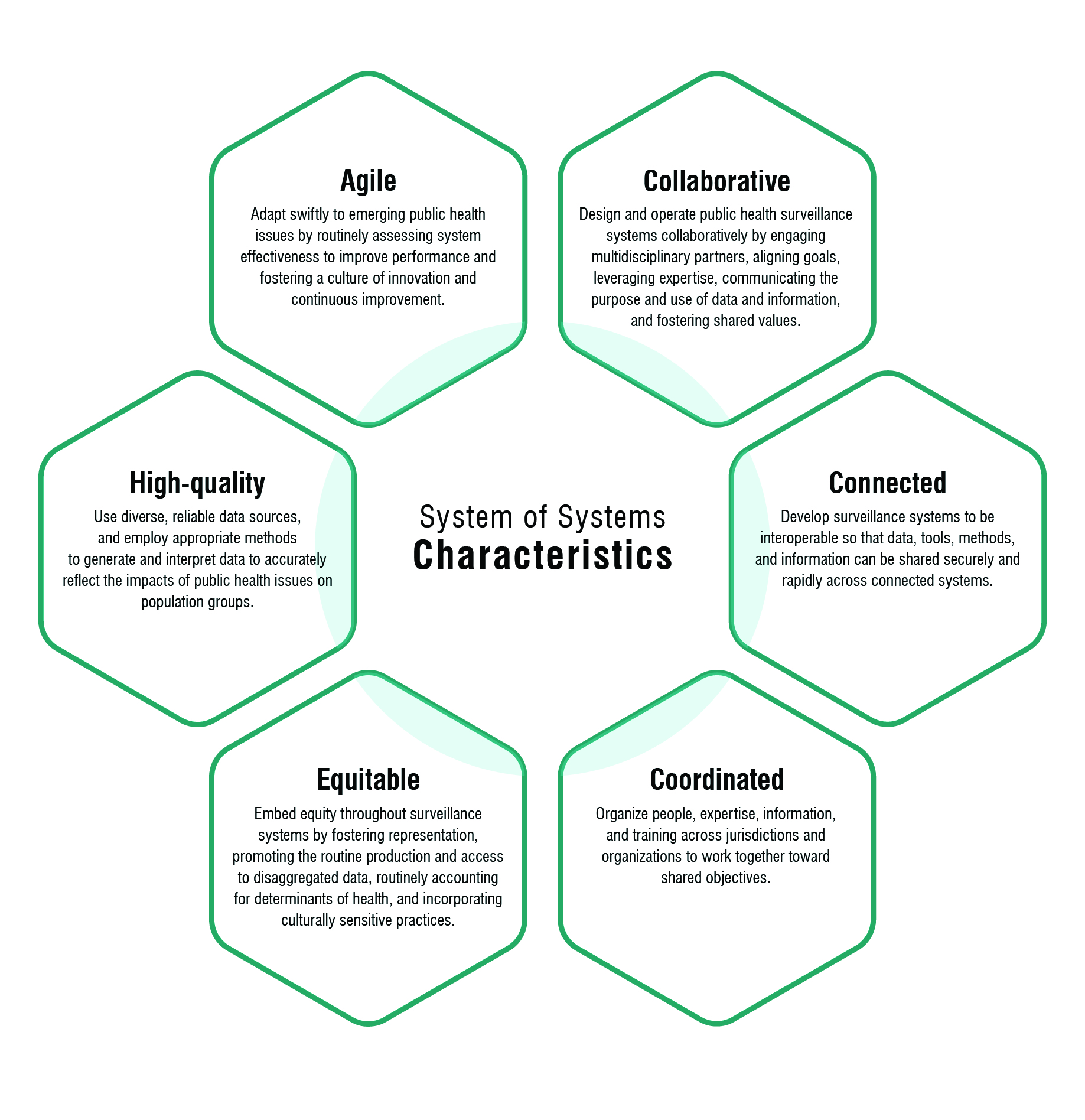 - describe the characteristics of a high-functioning public health surveillance 'system of systems'; and,