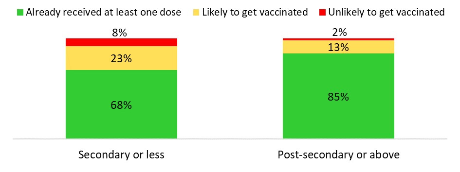 The proportion of individuals who were unlikely to get vaccinated against COVID-19 was higher in those with secondary education or less.