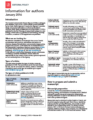 We welcome submissions of manuscripts from across Canada and elsewhere with practical, authoritative information on infectious diseases that will inform communicable disease policy, program and practice. CCDR follows the recommendations of the International Committee of Medical Journal Editors (ICMJE) Footnote 1 and the Treasury Board of Canada Secretariat policies on publishing, official languages Footnote 2 and web accessibility Footnote 3. CCDR does not contain policy statements, except as summaries of Advisory Committee statements. Authors retain the responsibility for the content of their articles; opinions expressed are not necessarily those of the Agency.