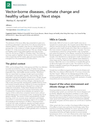 Mathieu K, Karmali M. Vector-borne diseases, climate change and healthy urban living: Next steps. Can Comm Dis Rep 2016;42:219-21. https://doi.org/10.14745/ccdr.v42i10a13