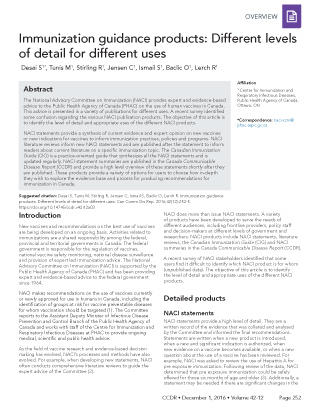 Desai S, Tunis M, Stirling R, Jensen C, Ismail S, Baclic O, Lerch R. Immunization guidance products: Different levels of detail for different uses. Can Comm Dis Rep 2016;42(12):252-5. https://doi.org/10.14745/ccdr.v42i12a03